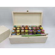 Wooden box of excellent quality of national manufacture. Outside 31x15x11. Inside 29x13x10cm. Although they are useful for anything, we have designed them to store 24 bottles of acrylic paints of 59cl and a small compartment to place some brushes. In this way it becomes a good storage for your paints, or to make a nice and elegant gift that can become the best gift for any lover of crafts. We sell it to you loose in case you already have the paintings or we offer you the possibility of acquiring the paintings of your choice at a discount.
